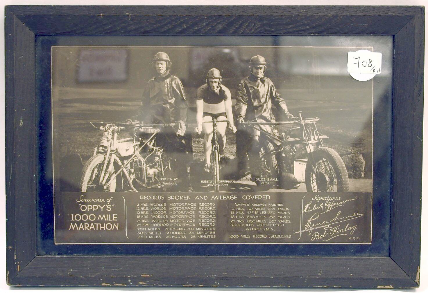 Wooden framed photograph featuring an image of Hubert Opperman on his bicycle flanked by two pace motorcyclists, Bob Finlay and Bruce Small. Printed text below the image notes the records broken and mileage covered by Opperman as well as the printed signatures of the three men.