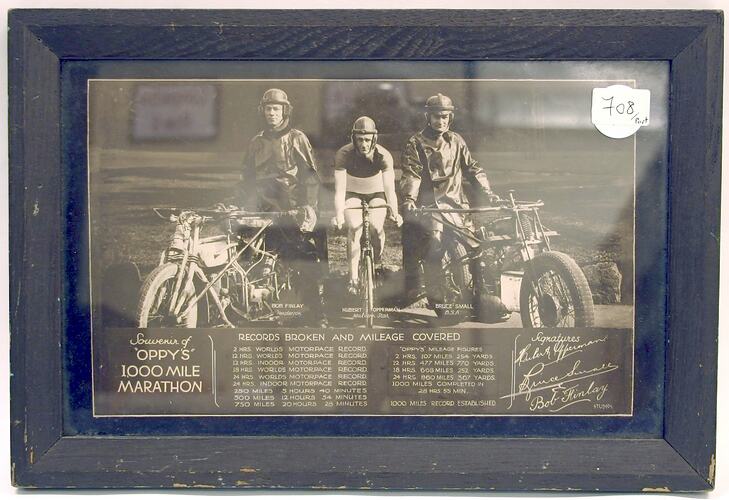Wooden frame painted brown that contains a black and white image of Hubert Opperman on his bicycle flanked by two pace motorcyclists, Bob Finlay and Bruce Small. Printed white text includes the names and printed signature of each man as well as Opperman's records and achievements. Frame has glass. Label affixed to reverse of frame has maker's details in printed red text.
