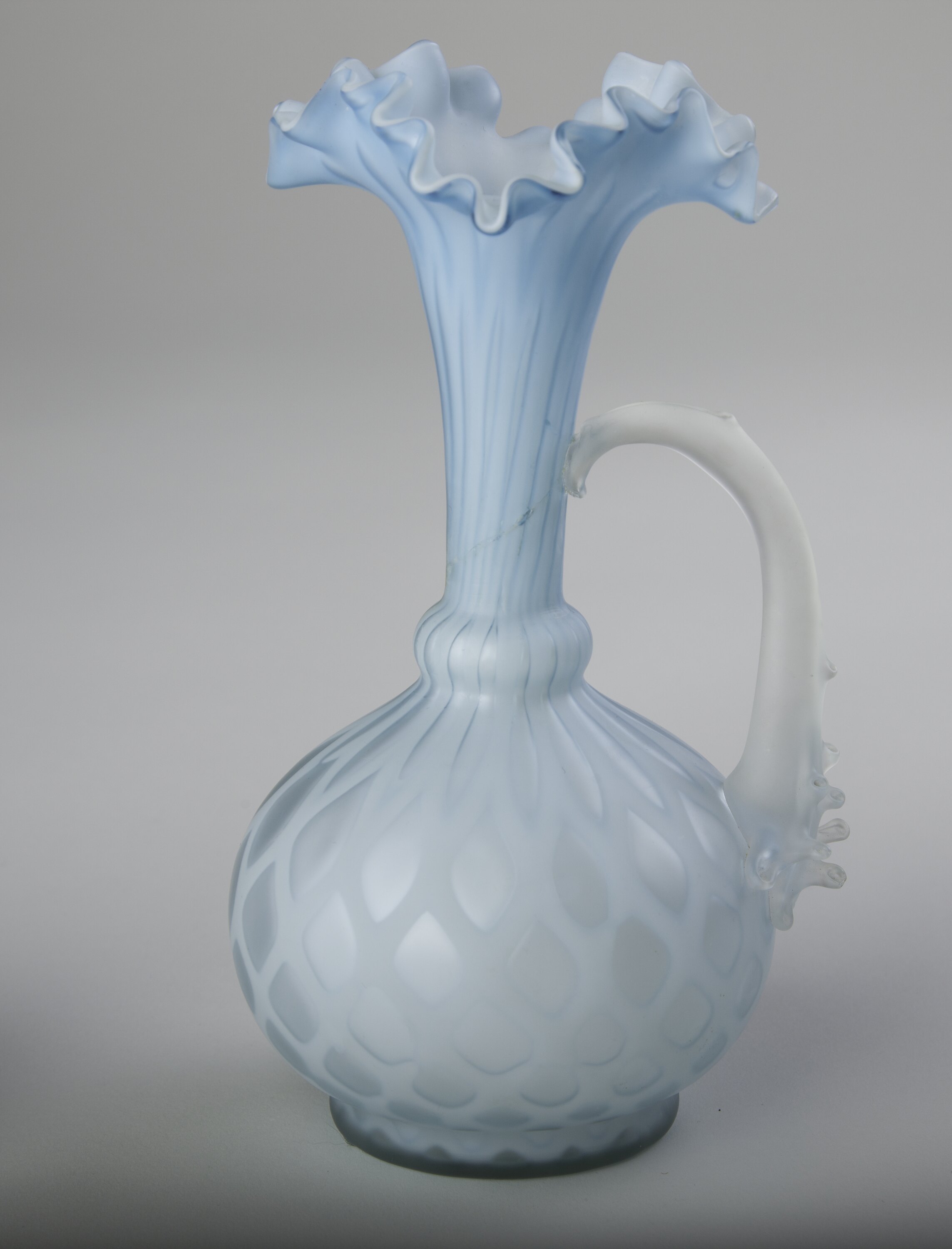 Pair of blue glass vases, with rounded bases and fluted tops. The vases would have made by blown into a mould and hand-shaped at the fluted top with pincers. The clearer glass handle would have been added afterwards.