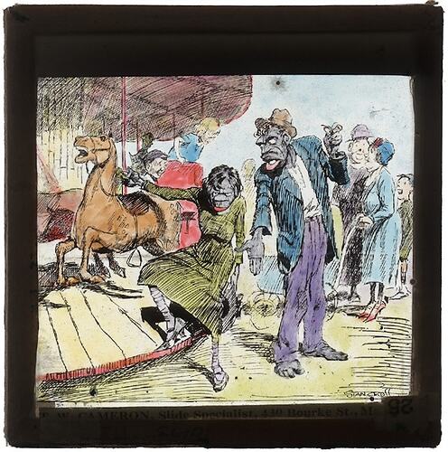 Lantern slide of a cartoon by cartoonist Stan Cross of an First Peoples man and woman standing by a carousel at a fairground. Made by T.W. Cameron, Melbourne, Victoria, circa 1930s-1940s.
