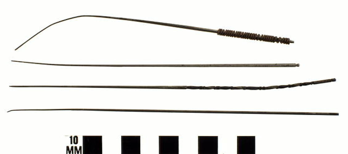 Set of seven steel opium dippers (also known as opium needles) which are part of a group of opium related objects obtained in a raid on Chinese premises by investigating officers from the Victorian Customs Department circa 1900s-1930s. Opium use was widespread in China between the 17th and 19th Centuries with the British East India Company importing large quantities of the drug. Chinese attempts to ban the opium trade and resistance against the foreign intervention it represented culminated in the Opium Wars of the early to mid-19th Century when force of arms ensured that Chinese ports remained open to opium.