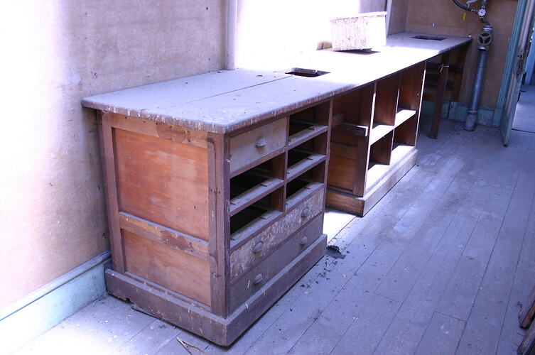 White porcelain sink. Found on top of laboratory bench. Located in top floor laboratory used during World War II for bacterial research. the Melbourne & Metropolitan Board of works conducted experiments on concrete corrosion caused by bacteria in pipes.