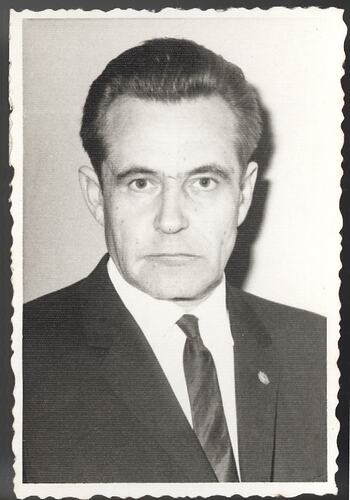 Black and white passport photo of Alexander Caurs, circa 1950.