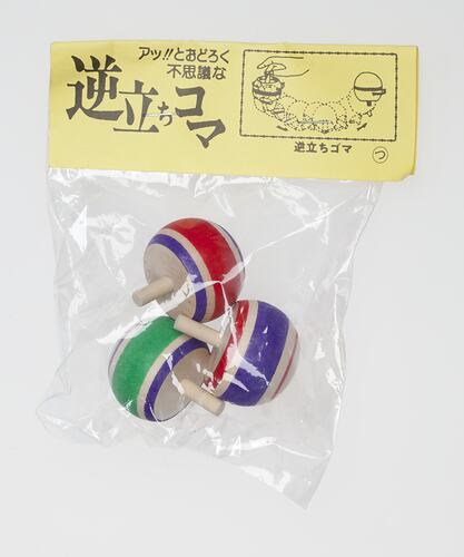 The three tops are still in their original plastic packaging with a yellow label bearing Japanese print attached.These tops are made of wood. They each consist of a small wooden spike which pierces a round body. The bodies of the tops are painted with stripes. One top has a thick red stripe and thin purple stripes. One has a thick purple stripe and thin red stripes. Another has a thick green stripe and thin purple stripes.