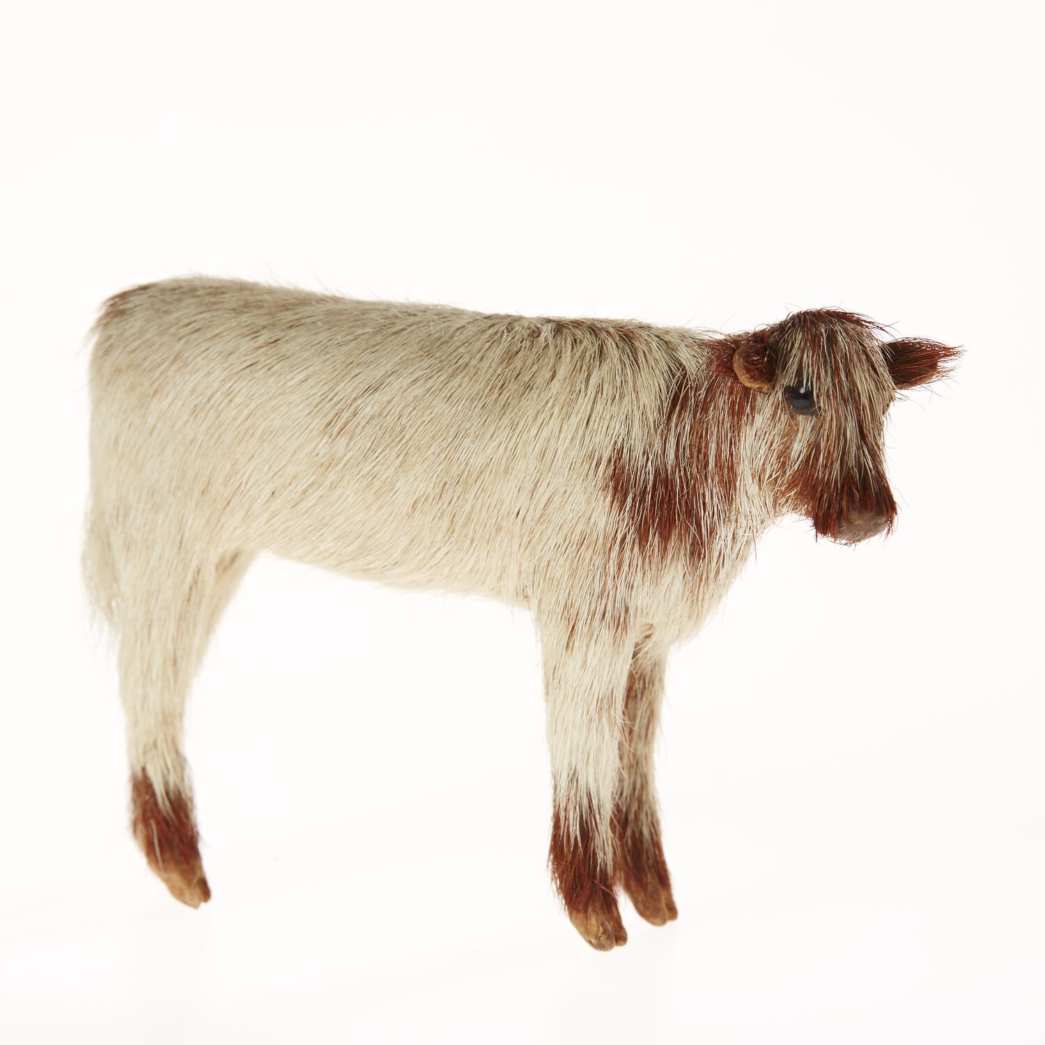 The model consists of a paper mache armature, shaped with bees wax, and red and white coat consisting of cow hair. The eyes are probably made of glass, with ears & hooves of wood. Horns are made from real horn whittled down to size. Scale approx. 1:22. [To be confirmed]