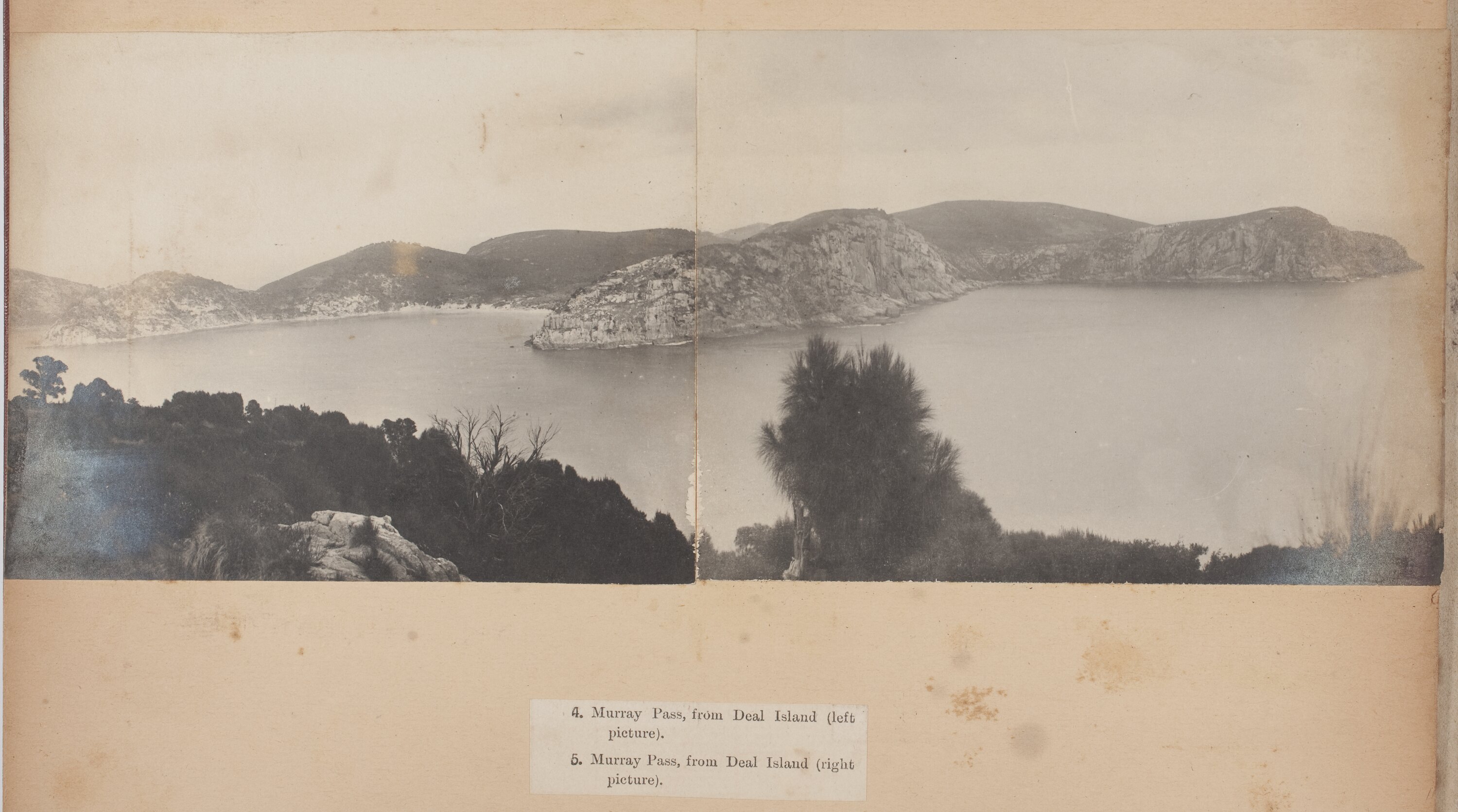 View of Murray Pass, the stretch of water which separates Deal Island from Erith and Dover Islands in the Kent Group, Bass Strait. This is one of sixty-nine black and white and sepia photographs in a bound album [six of which are loose] taken by A J Campbell during a Field Naturalists' Club of Victoria expedition to Kent Group of islands, Bass Strait in 1890. The album also includes a map of Kent Group in the inside front cover and numerous contemporary newspaper clippings relating to the expedition.