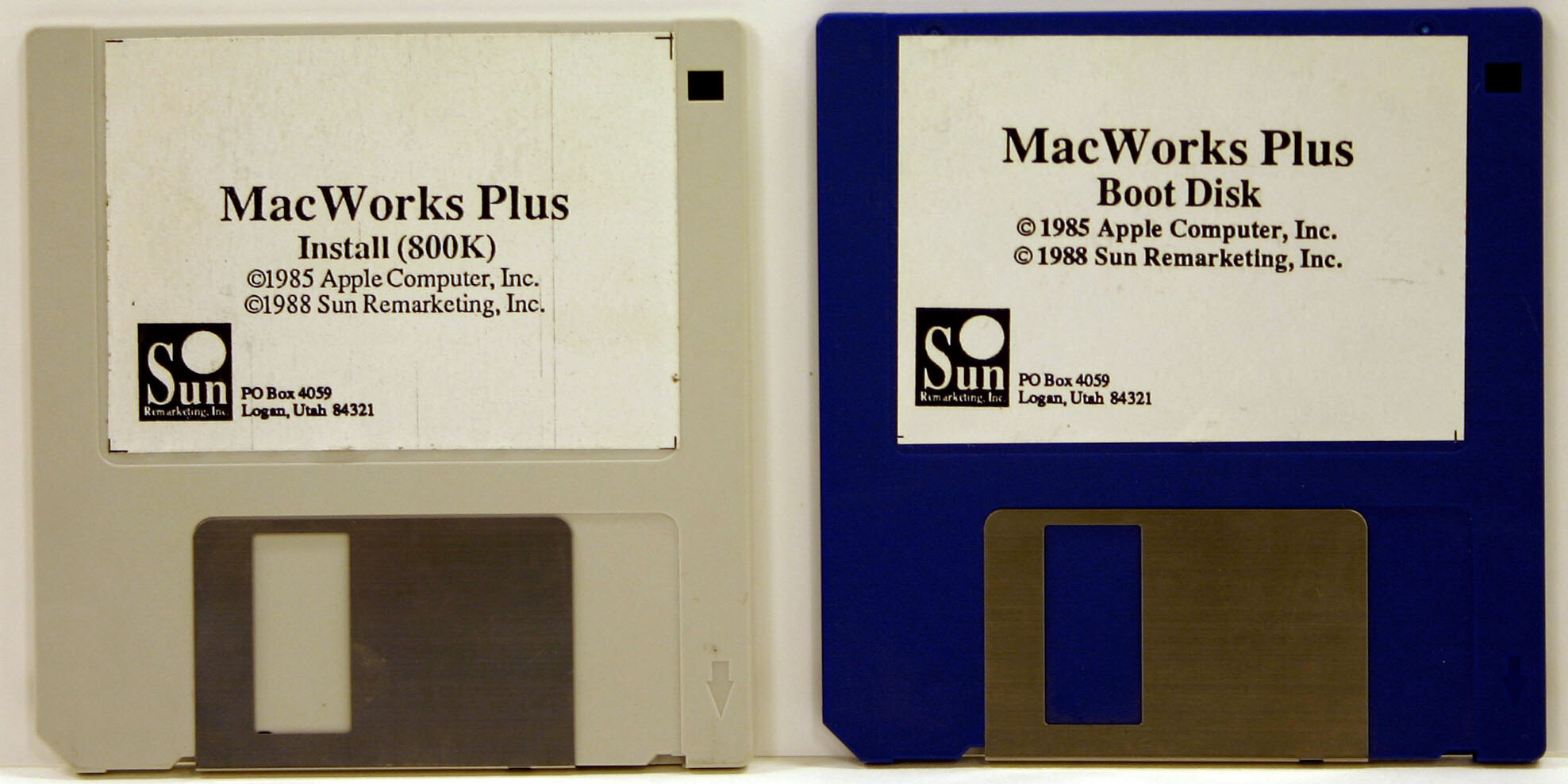 MacWorks Plus Install (800K) © 1985. Apple Computer Inc. © 1988 Sun Remarketing, Inc. Sun logo and address. MacWorks Plus Boot Disk © 1985. Apple Computer Inc. © 1988 Sun Remarketing, Inc. Sun logo and address.