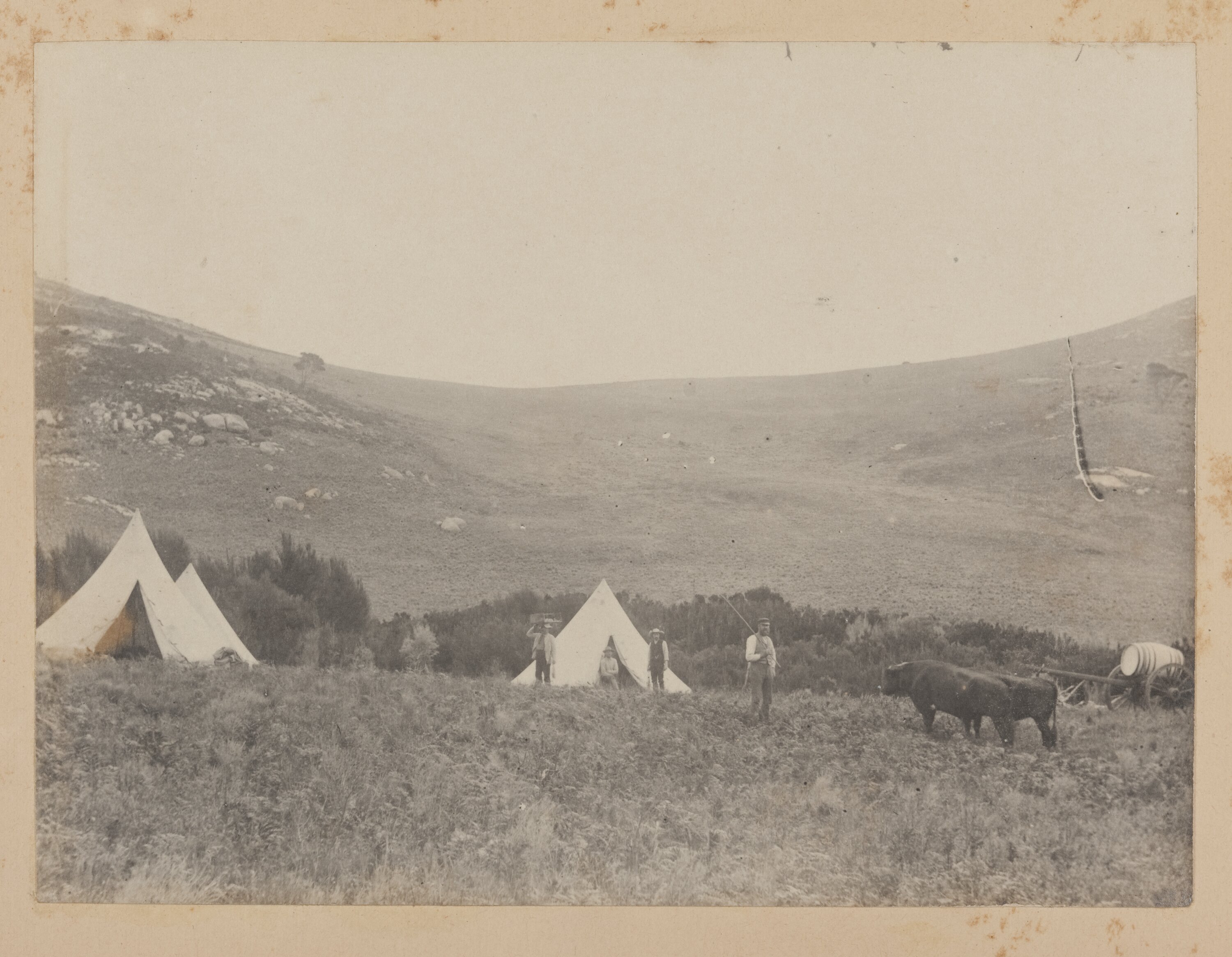 The Field Naturalists Club of Victoria campsite on Deal Island, Bass Strait. Pictured are four members of the club in front of three tents. To the right are two bullocks and a cart laden with a water barrel. The campsite is at the foot of a low cliff with sparse vegetation. Photograph taken by Archibald J. Campbell during a scientific expedition by the Club to the Kent Group islands in 1890.