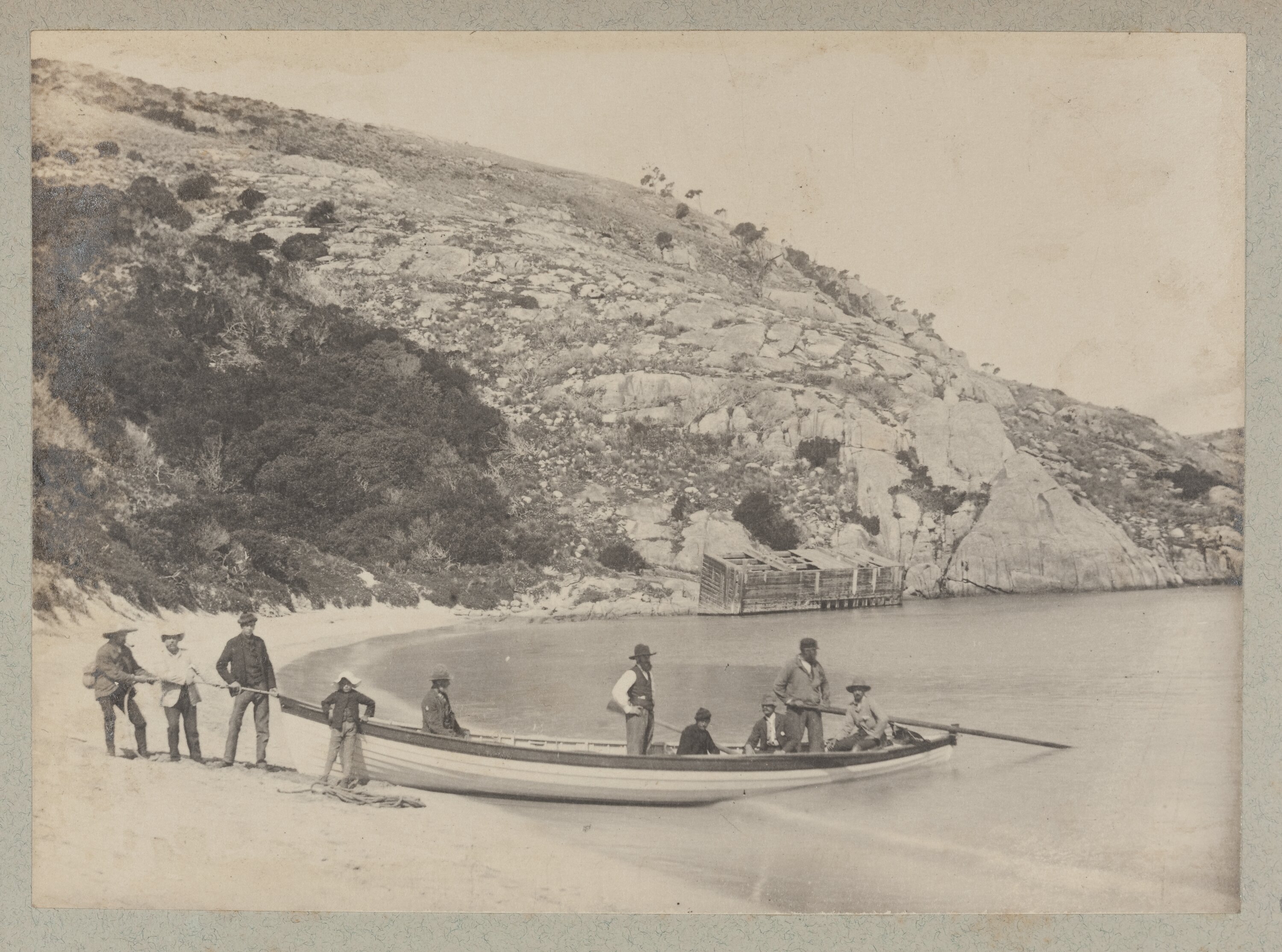 Members of the Field Naturalists Club of Victoria setting out on a boating expedition on Erith Island, the Kent Group, Bass Strait. Pictured are six men in a row boat with three other men and a boy on the foreshore. In the background is a rocky cliff at the base of which is a wooden enclosure. Photograph taken by Archibald J. Campbell during a scientific expedition by the Club to the Kent Group islands in 1890.