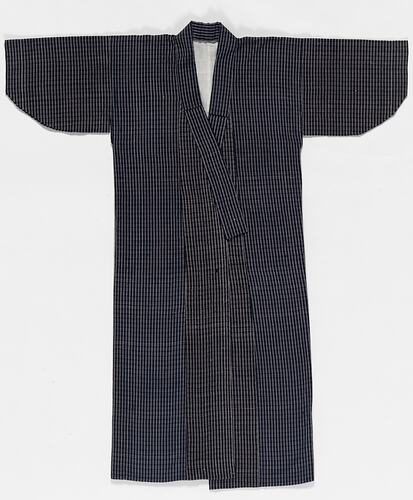 Blue cotton and silk striped kimono woven by the mother of Masumi Hiraga Jackson, Kino, around 1915 when she was about 18. Kino later altered the kimono around 1985-86. Masumi brought it with her when she migrated to Australia in 1985 but never wore it herself. The women in Masumi's family have woven and sewn kimonos since the early 20th century. Kimonos are traditional Japanese garments, worn by men and women. Kimonos vary in style, colour, pattern and fabric depending on the occasion and the wearer. Masumi's kimonos hold special meaning for her, as mementoes of her homeland and as cultural artefacts which she wears socially and for performances.