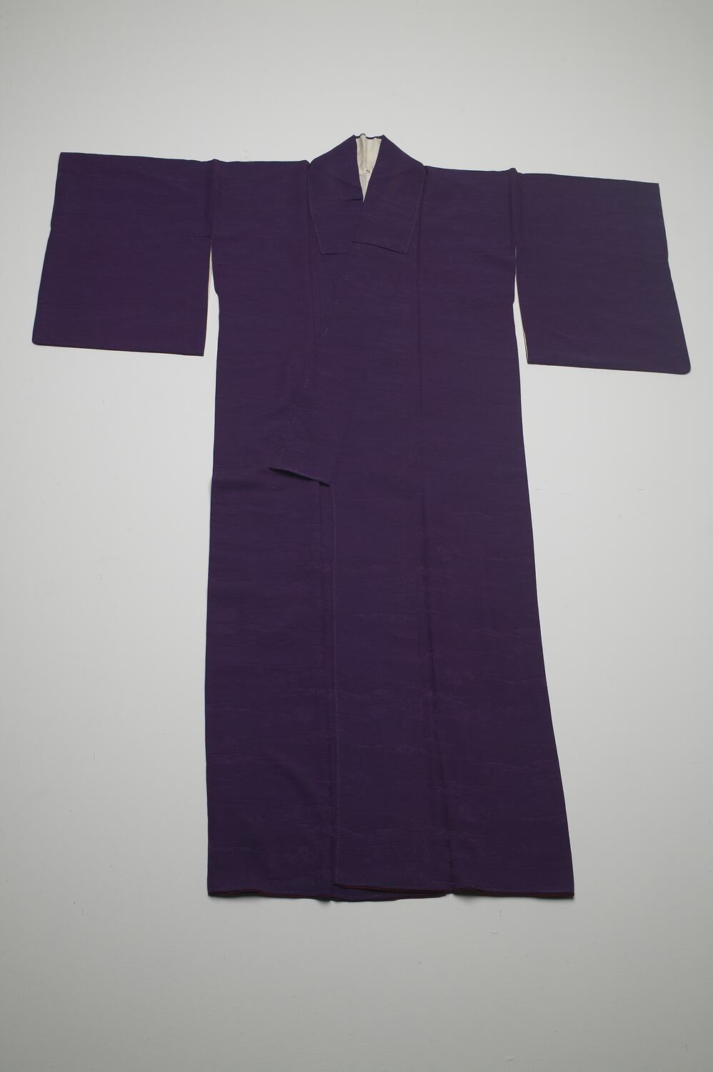 Kimono, purple 'Rinzu' silk. A crest weaving which usually means 'wrinkled cloth'. After weaving, fabric becomes refined, smooth, tough row silk cloth with gloss. The interior lining of the kimono features a burgundy and white cotton lining.
