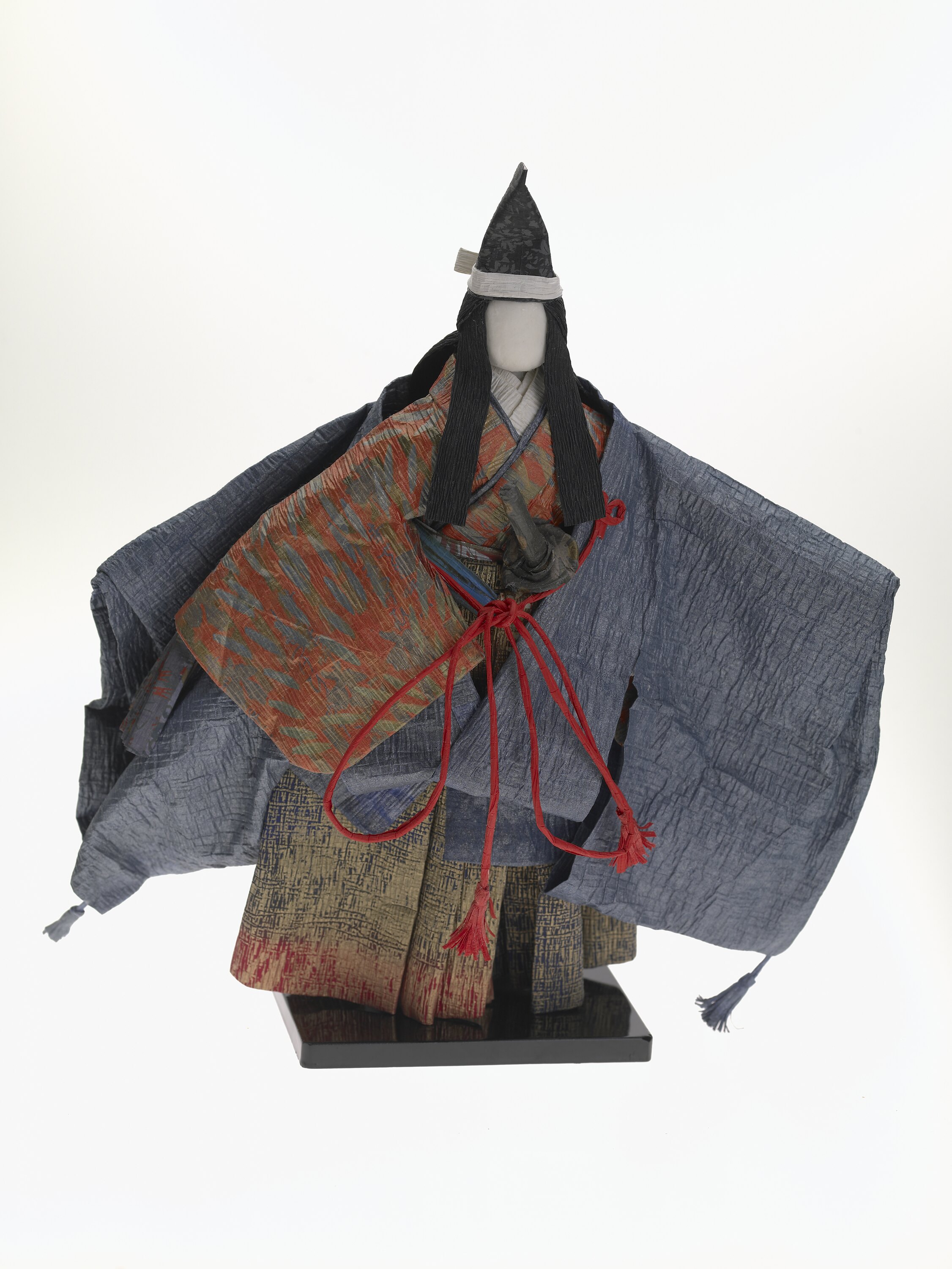 The paper doll is wearing an elaborate blue and orange patterned kimono, with a sword attached to this left hand side, and a pointed grey hat. The hair is long and black. The doll is made from a dyed crepe paper, made flexible for doll making through a process of squeezing and pleating the paper. Patterns reflect kimono patterns. White tissue paper and cotton is used to make the head, body and other body parts. Doll is placed on a rectangular black lacquer stand.