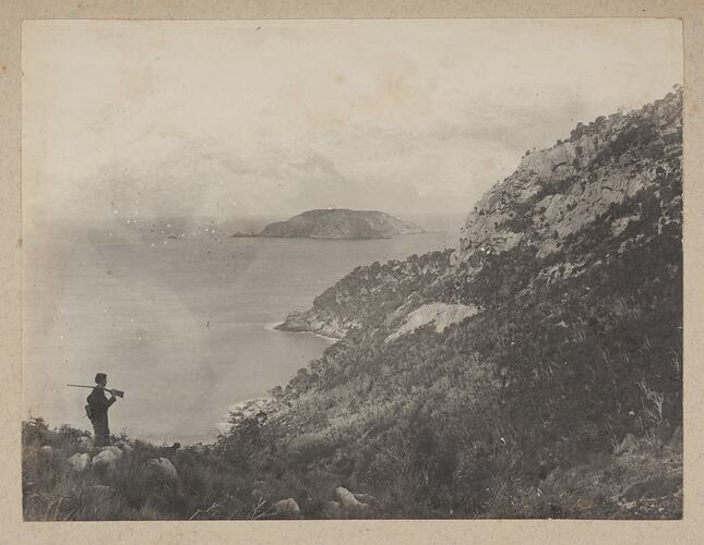View of the rocky coastline of Deal Island, Bass Strait. In the foreground is a man holding a rifle. In the distance is either North East Island or Mutton Bird Island. Photograph taken by Archibald J. Campbell during a scientific expedition by the Field Naturalists Club of Victoria to the Kent Group of islands, Bass Strait, in 1890.