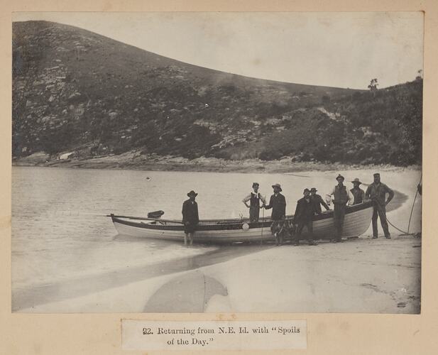 Members of the Field Naturalists Club of Victoria returning to their base camp on Deal Island after a day of collecting samples of the indigenous flora and fauna on nearby North East Island. There are eight men standing alongside a row boat which is anchored on the foreshore. Some of the items which the men have collected are hanging on the side of the boat. The men are standing in front of a low cliff with low vegetation. Photograph taken by Archibald J. Campbell during the Club's scientific expedition to the Kent Group of islands, Bass Strait, in 1890.