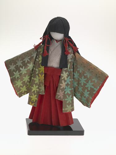 The paper doll is wearing a kimono in patterned and coloured tones of brown, green, yellow and pink, with a red 'hakama' (long pleated culotte-like skirt). The hair is long and black and tied in ponytails. The doll is made from a dyed crepe paper, made flexible for doll making through a process of squeezing and pleating the paper. Patterns reflect kimono patterns. White tissue paper and cotton is used to make the head, body and other body parts. Doll is standing on a rectangular shaped black lacquer stand.