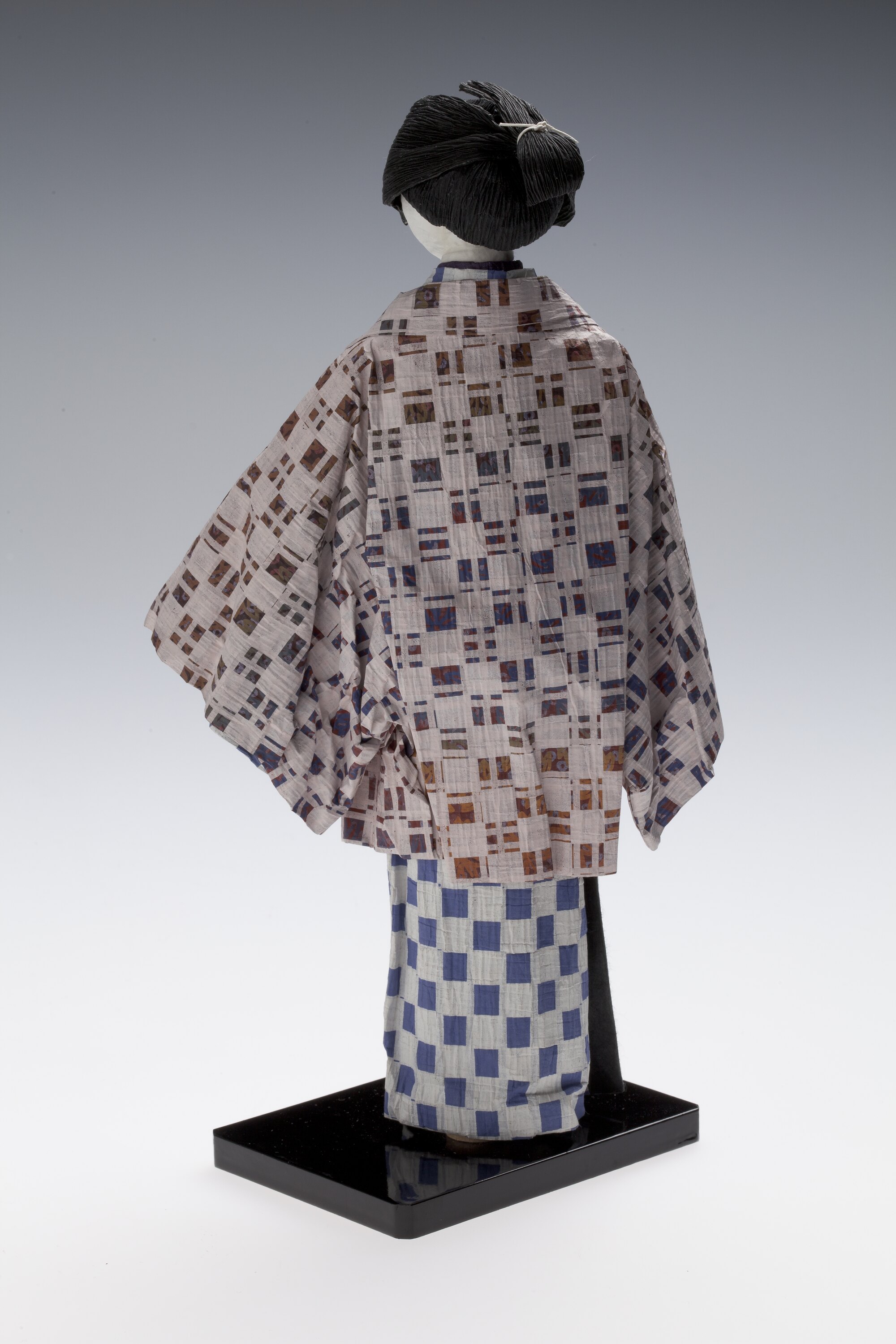 The paper doll is wearing a kimono and a kimono jacket in checkered patterned and coloured tones of white and brown, and blue and white. The hair is black and worn up in a bun. The doll is made from a dyed crepe paper, made flexible for doll making through a process of squeezing and pleating the paper. Patterns reflect kimono patterns. White tissue paper and cotton is used to make the head, body and other body parts. Doll is standing on a rectangular shaped black lacquer stand.