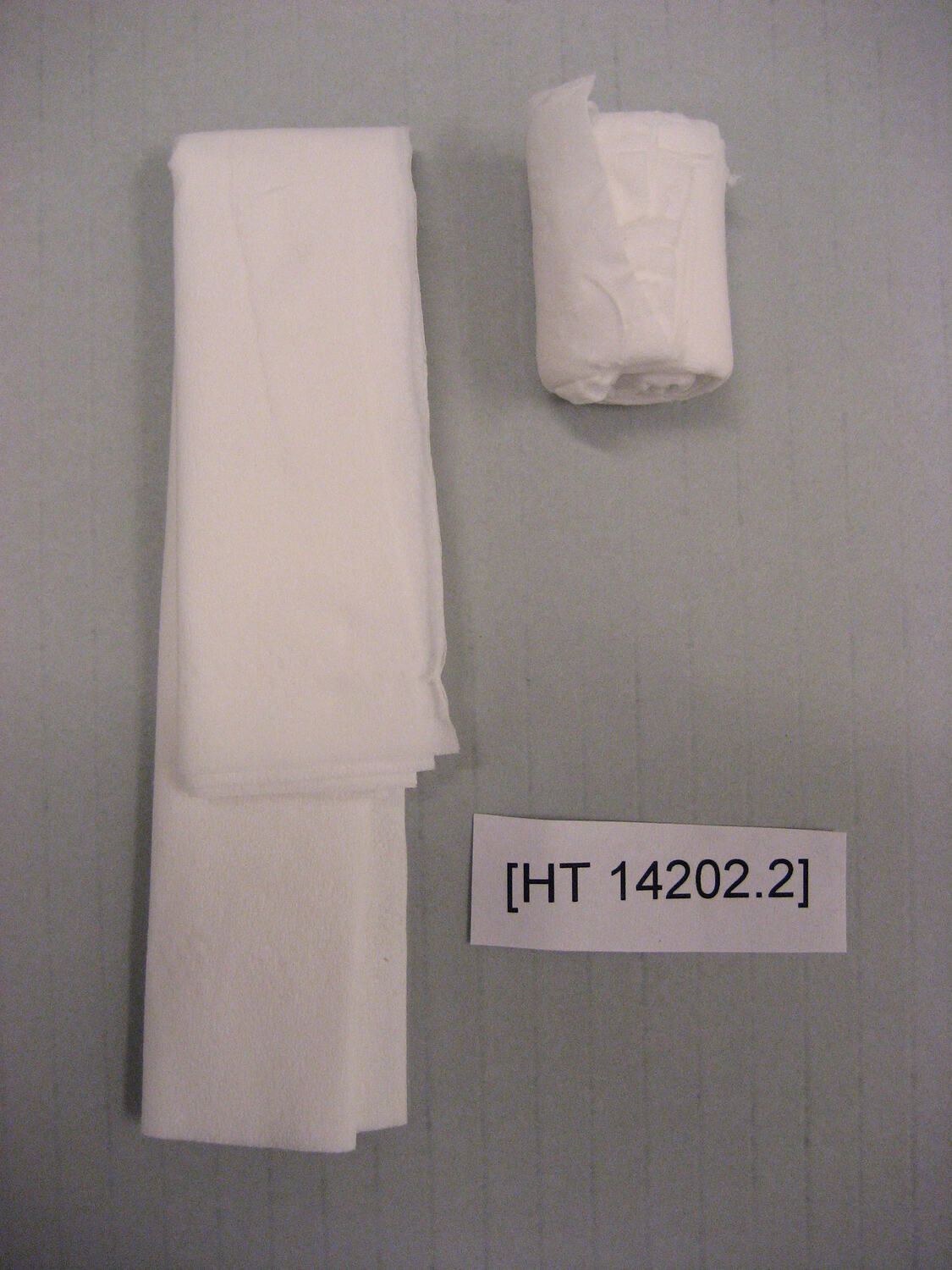 Part 2 of a series of 15 steps in making a Shimotsuke doll. Part two is comprised of two pieces of white tissue paper in the plastic bag in which it is contained and numbered, in accordance with the sequence of production. One piece of tissue is rolled into a cylindrical shape to from the beginning of the head of a doll.
