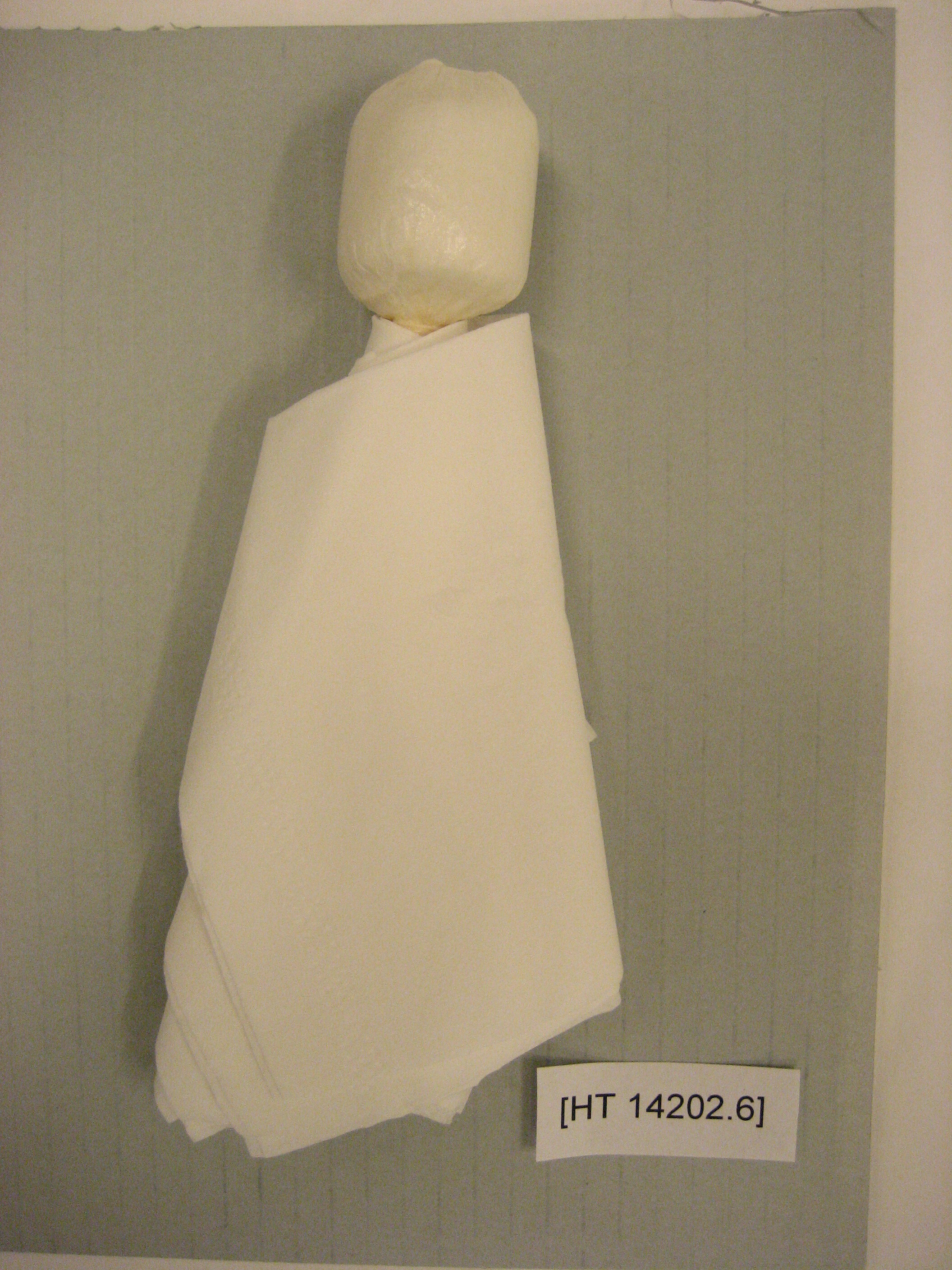 Part 6 of a series of 15 steps in making a Shimotsuke doll. Part six is comprised of pieces of white tissue paper in the plastic bag in which it is contained and numbered, in accordance with the sequence of production. One piece covers the lower part of what forms the beginning of the head and body of a doll.