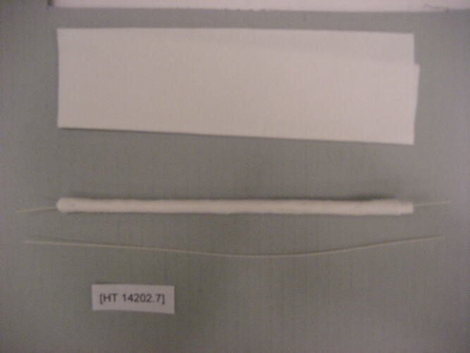 Part 7 of a series of 15 steps in making a Shimotsuke doll. Part seven is comprised of pieces of white tissue paper and cotton string in the plastic bag in which it is contained and numbered, in accordance with the sequence of production. One piece is rolled over the cotton string.