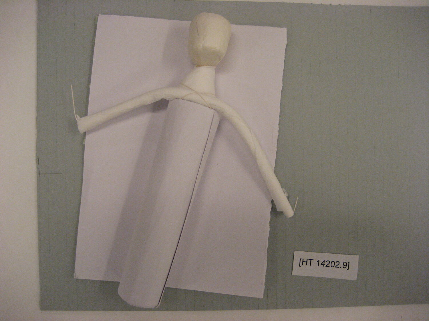 Japanese Shimotsuke paper doll in a series of 15 production steps. This is part 9 in the process. It was created by Masumi Hiraga Jackson in 2007 to demonstrate and document the process, step by step, of making a Shimotsuke doll.