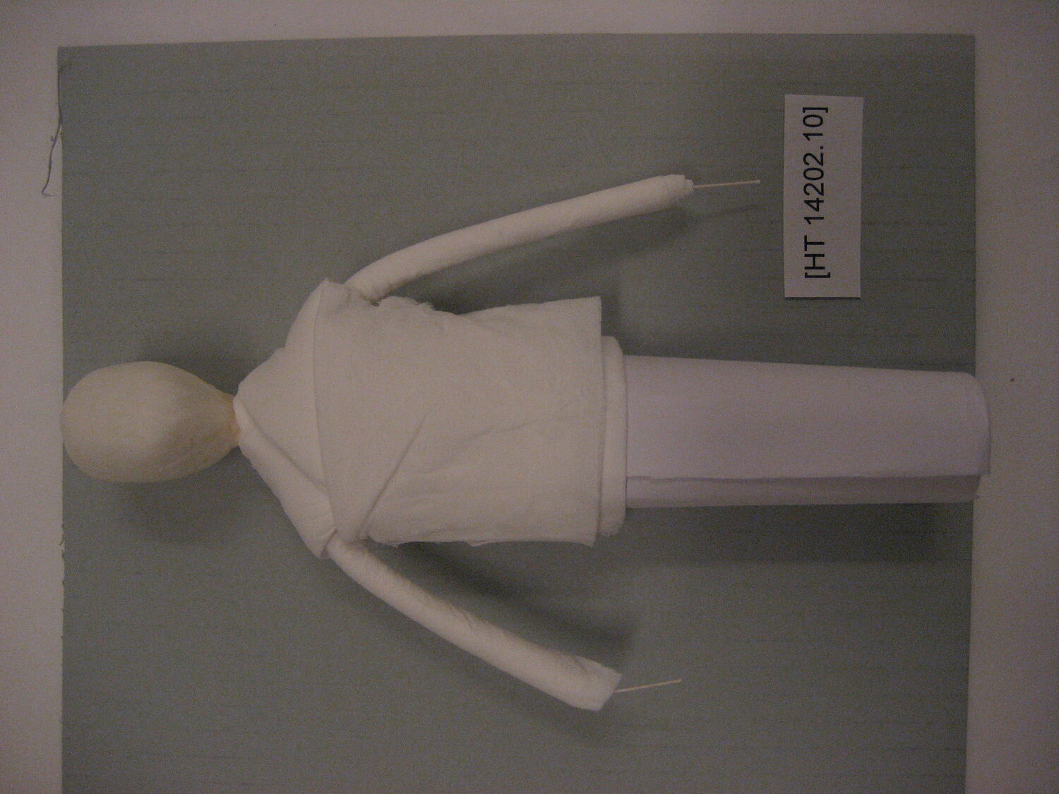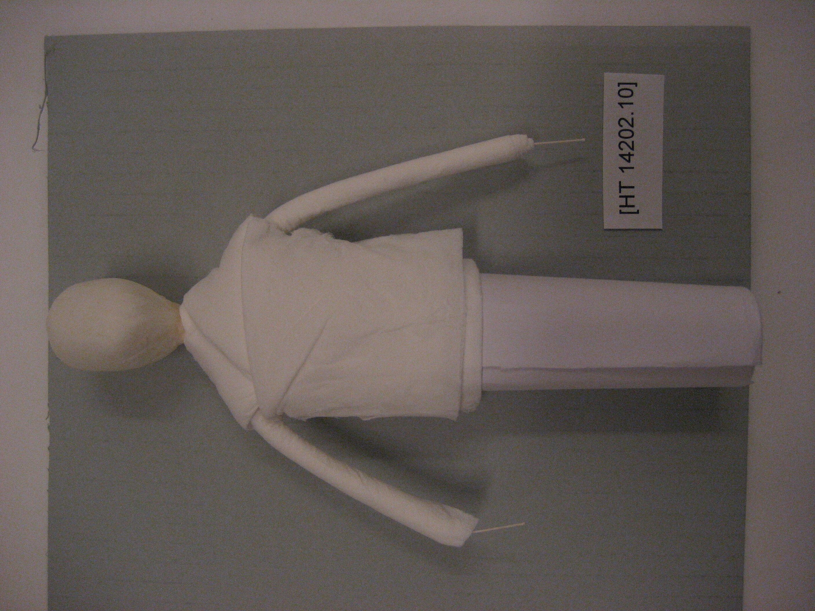 Japanese Shimotsuke paper doll in a series of 15 production steps. This is part 10 in the process. It was created by Masumi Hiraga Jackson in 2007 to demonstrate and document the process, step by step, of making a Shimotsuke doll.