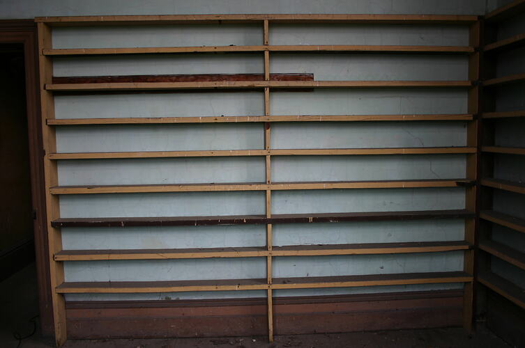 Built-in wooden shelving. Located in the tower of the North Engine Room. Believed to have used to store core samples take by MMBW staff.