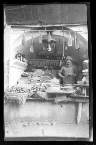 Black and white photographic negative depicting a Kurdish woman at a food stall, taken during World War I.