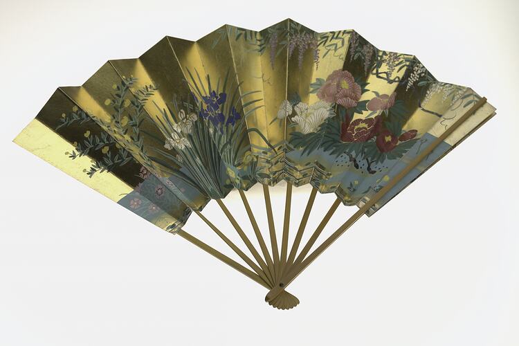 Shimai paper fan with handpainted coloured flowers and gold detailing. It was used by Masumi Hiraga Jackson in Noh dance performances in the 1990s. Noh is an important form of classical musical drama performed in Japan since the 14th century. The principal actor, and sometimes minor actors wear masks. All performers, including the chorus singers and musicians, carry fans. Masumi Hiraga studied Noh Theatre at Toyo University in the 1950s and continues to learn and practise the art at the Hosho School of Noh in Japan. She performs in Japan and Australia.