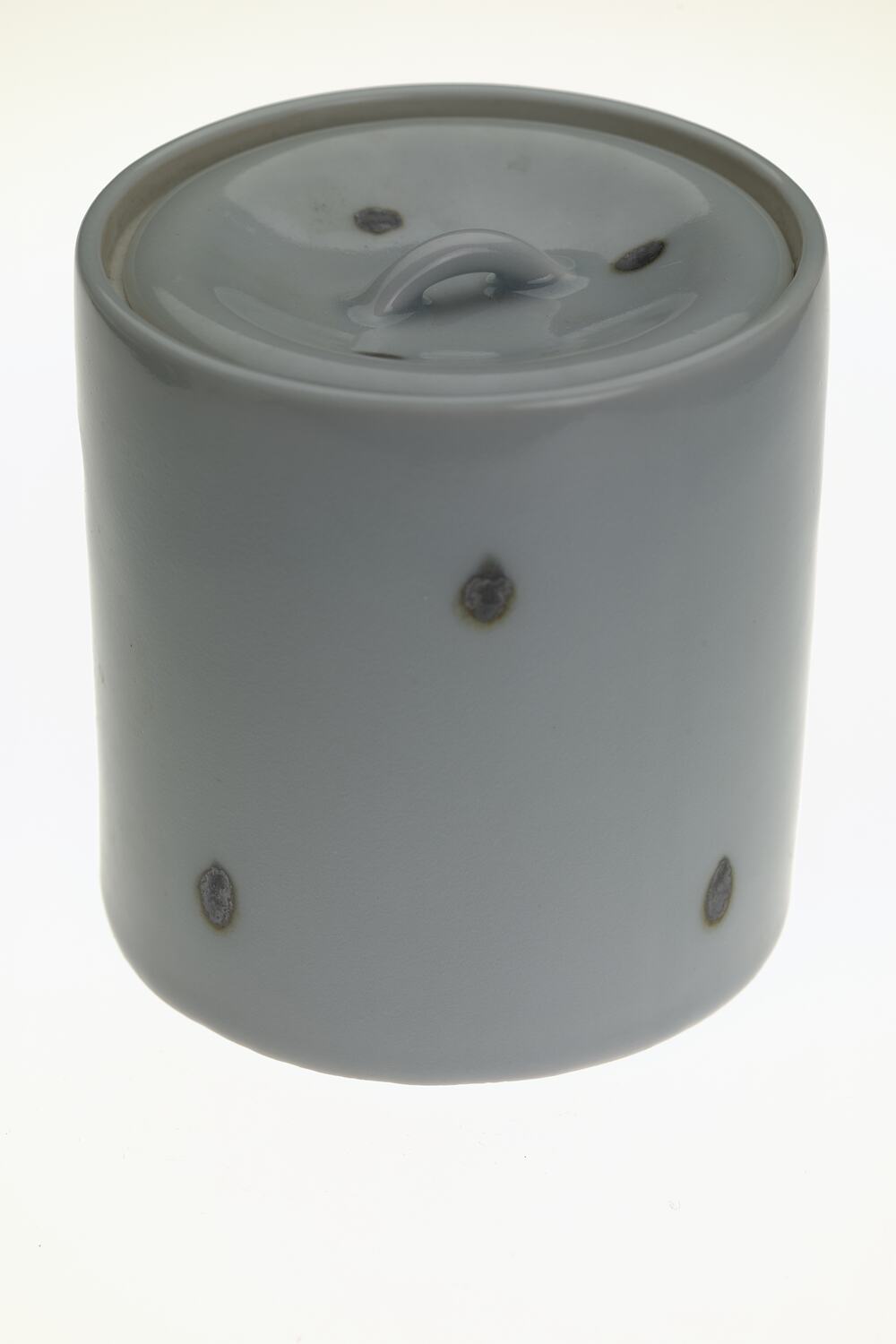 A cylindrically shaped, lidded ceramic water jar, with a blue-glaze and black spots. Water jar is hand-thrown.