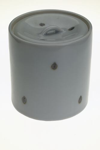 Ceramic lidded water jar. It is part of a traditional Japanese 'hibati' tea-ceremony set, brought to Australia by Masumi Hiraga Jackson when she migrated to Australia in 1985. Masumi practices traditional Japanese tea ceremony in Melbourne, as part of her endeavours to maintain Japanese cultural activities in Melbourne. For Masumi, the traditional Japanese tea ceremony is an art form, one of beauty, tranquillity and simplicity of movement. Tea ceremony is the ritualised way of preparing, serving and drinking 'matcha' (powdered green tea). Tea drinking was introduced from China and first practised only by Buddhist priests, and then by samurai warriors. It gradually spread throughout Japan. Greatly influenced by Zen Buddhism, the tea ceremony has in turn influenced many aspects of Japanese culture.