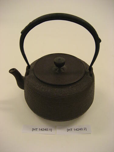 Small iron kettle, miniature size. It is part of a traditional Japanese 'hibati' tea-ceremony set, given to Masumi Hiraga Jackson in the 1970s and brought by her to Australia when she migrated to Australia in 1985. Masumi practices traditional Japanese tea ceremony in Melbourne, as part of her endeavours to maintain Japanese cultural activities in Melbourne. For Masumi, the traditional Japanese tea ceremony is an art form, one of beauty, tranquillity and simplicity of movement. Tea ceremony is the ritualised way of preparing, serving and drinking 'matcha' (powdered green tea). Tea drinking was introduced from China and first practised only by Buddhist priests, and then by samurai warriors. It gradually spread throughout Japan. Greatly influenced by Zen Buddhism, the tea ceremony has in turn influenced many aspects of Japanese culture.