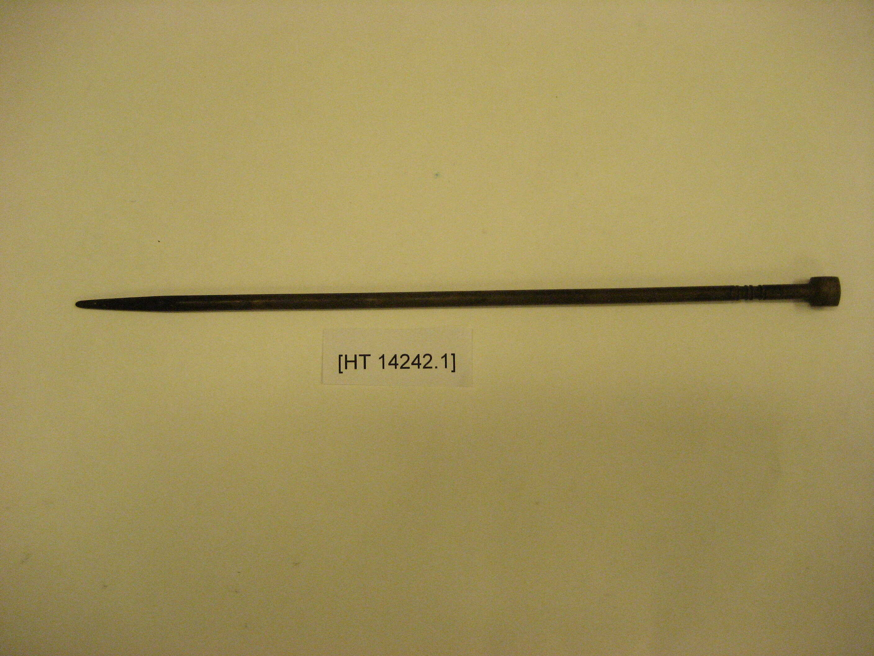 Solid bronze charcoal stick resembling a chopstick, with a circular barrel head at one end. Charcoal stick tapers down to one end.