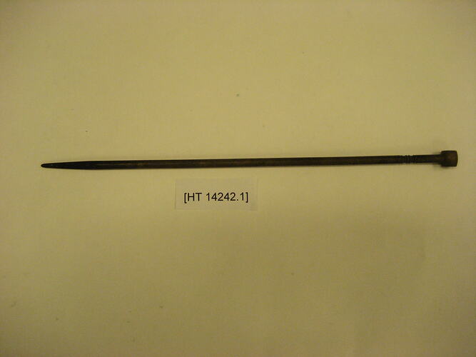 One of pair of metal charcoal sticks, used to pick up charcoal pieces for heating water. It is part of a traditional Japanese 'hibati' tea-ceremony set, brought to Australia by Masumi Hiraga Jackson when she migrated to Australia in 1985. Masumi practices traditional Japanese tea ceremony in Melbourne, as part of her endeavours to maintain Japanese cultural activities in Melbourne. For Masumi, the traditional Japanese tea ceremony is an art form, one of beauty, tranquillity and simplicity of movement. Tea ceremony is the ritualised way of preparing, serving and drinking 'matcha' (powdered green tea). Tea drinking was introduced from China and first practised only by Buddhist priests, and then by samurai warriors. It gradually spread throughout Japan. Greatly influenced by Zen Buddhism, the tea ceremony has in turn influenced many aspects of Japanese culture.