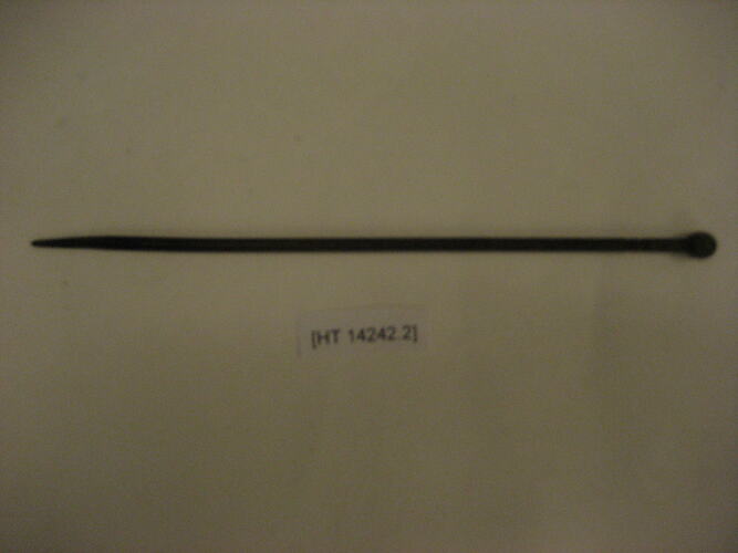 One of pair of metal charcoal sticks, used to pick up charcoal pieces for heating water. It is part of a traditional Japanese 'hibati' tea-ceremony set, brought to Australia by Masumi Hiraga Jackson when she migrated to Australia in 1985. Masumi practices traditional Japanese tea ceremony in Melbourne, as part of her endeavours to maintain Japanese cultural activities in Melbourne. For Masumi, the traditional Japanese tea ceremony is an art form, one of beauty, tranquillity and simplicity of movement. Tea ceremony is the ritualised way of preparing, serving and drinking 'matcha' (powdered green tea). Tea drinking was introduced from China and first practised only by Buddhist priests, and then by samurai warriors. It gradually spread throughout Japan. Greatly influenced by Zen Buddhism, the tea ceremony has in turn influenced many aspects of Japanese culture.