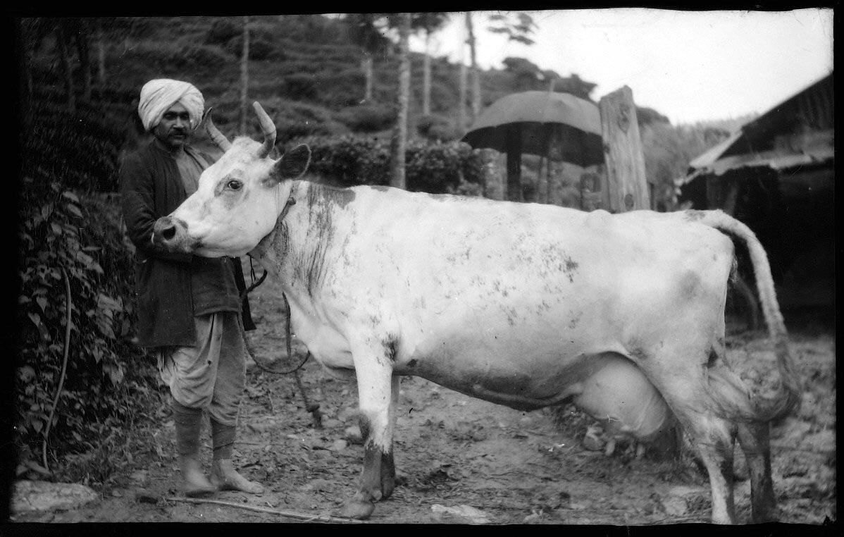 Black and white photographic negative depicting a Sikh man standing with a dairy cow, dating from World War I.