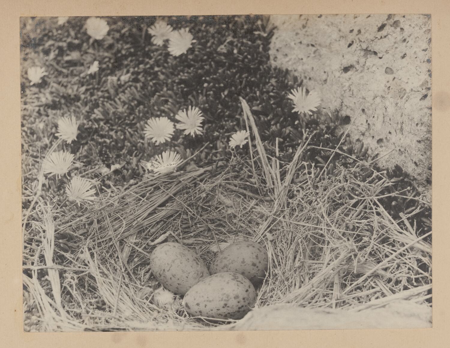 Bird's nest with three eggs of the Pacific Gull (Larus pacificus) on one of the islands of the Kent Group, Bass Strait. Photograph taken by Archibald J. Campbell during a scientific expedition by the Field Naturalists Club of Victoria to the Kent Group of islands in 1890.