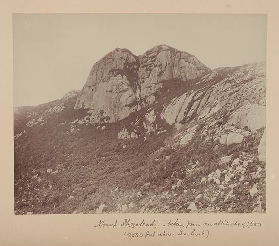 Caption below the photograph handwritten in black ink on backing board: "Mount Strezelecki - taken from an altitude of 1,500 (2,550 feet above sea-level)".