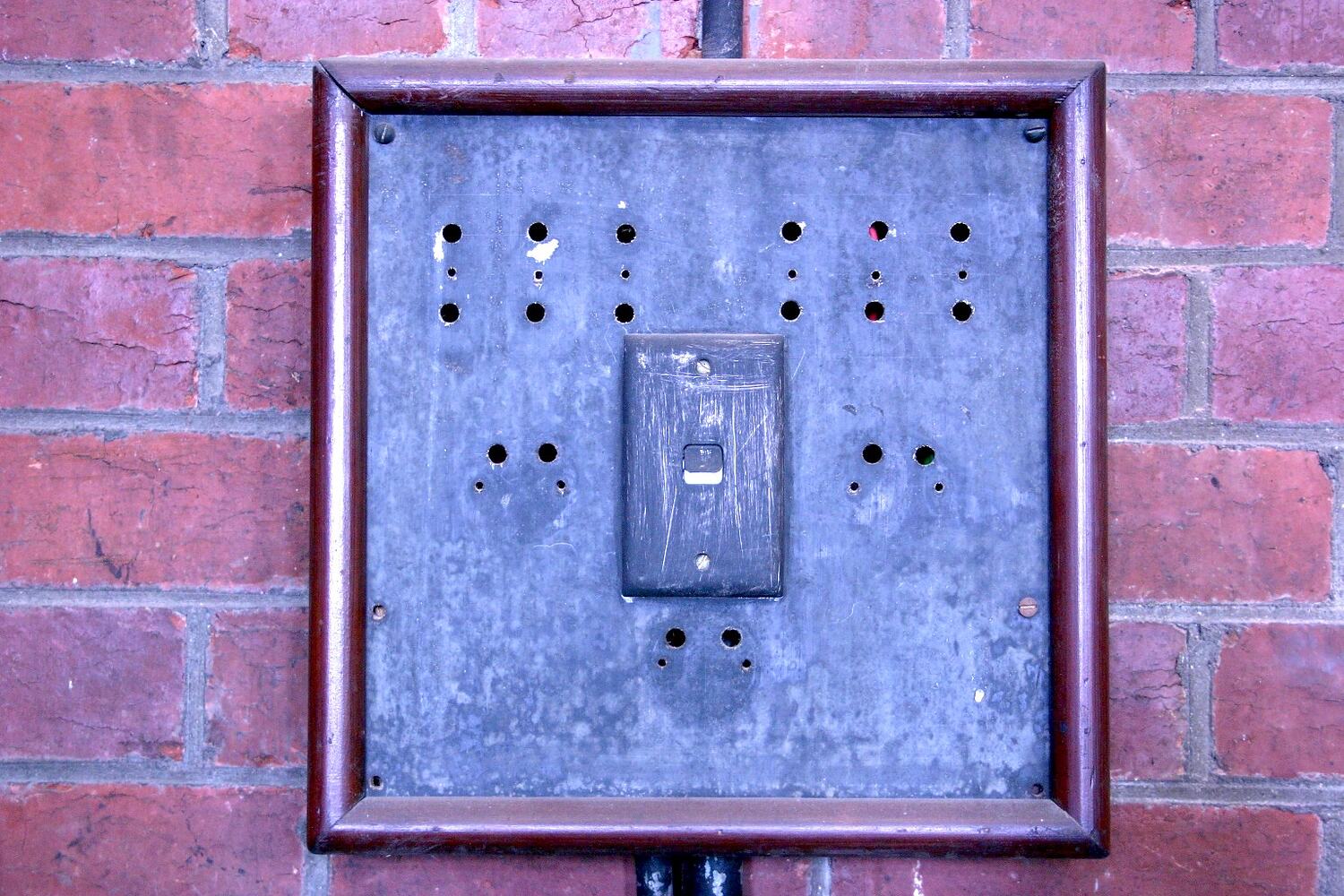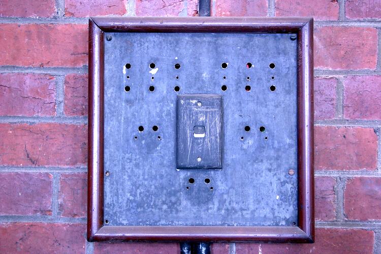 Switchboard with modern type light switch. Original switches and fuses have been removed. Located in the South Engine Room.