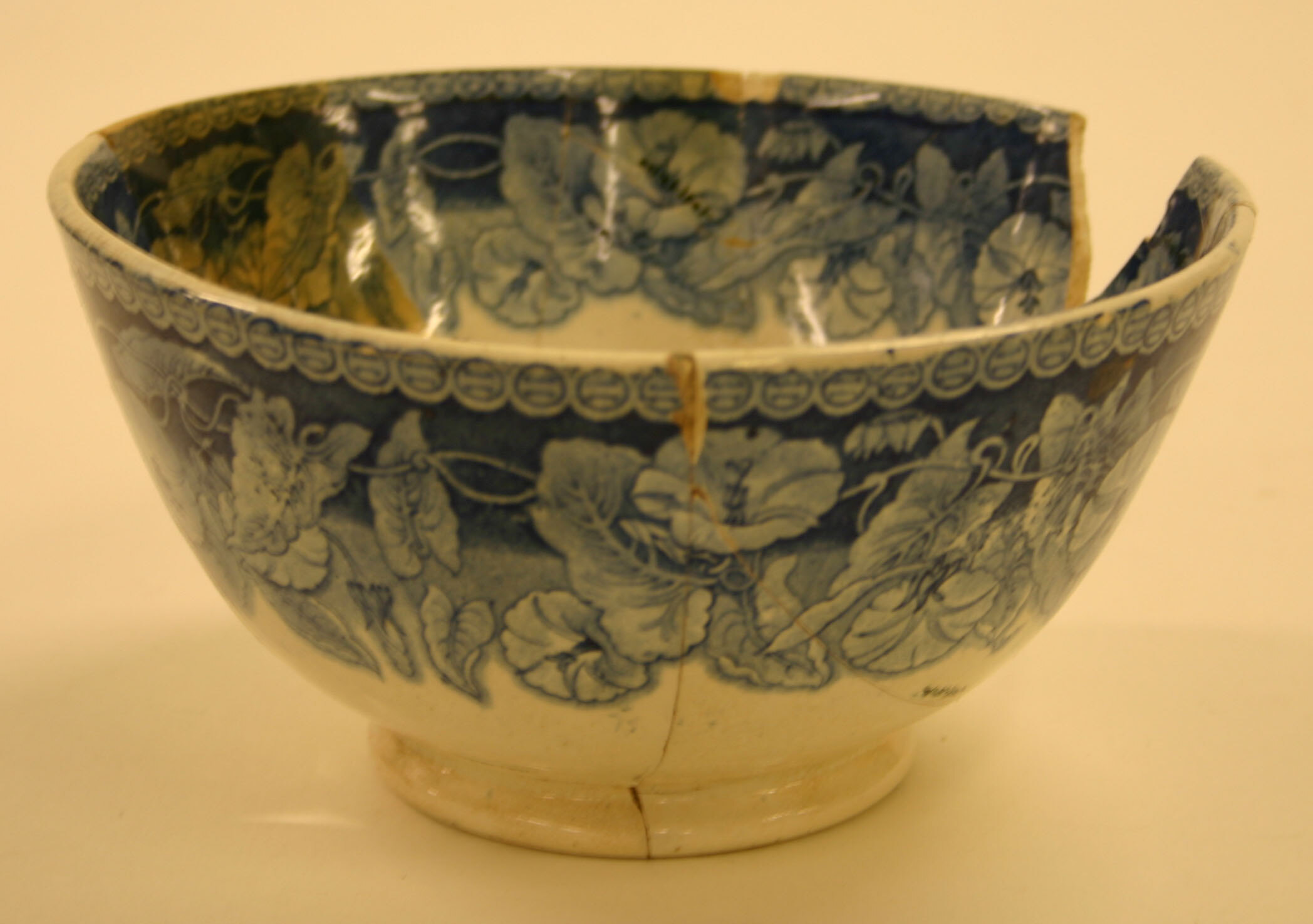 Large blue and white bowl with fine pattern of convoluvous flowers and an interior view of a couple with houses, tree, lake and distant castle. Rustic, probably seconds of good design. also contains fragments from 57/13/-/54/-; 57/13/-/23/-