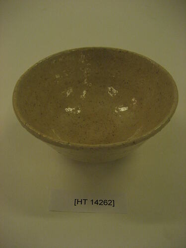 Japanese ceramic tea bowl, used for serving tea. It is part of a traditional Japanese 'hibati' tea-ceremony set, brought to Australia by Masumi Hiraga Jackson when she migrated to Australia in 1985. Masumi practices traditional Japanese tea ceremony in Melbourne, as part of her endeavours to maintain Japanese cultural activities in Melbourne. For Masumi, the traditional Japanese tea ceremony is an art form, one of beauty, tranquillity and simplicity of movement. Tea ceremony is the ritualised way of preparing, serving and drinking 'matcha' (powdered green tea). Tea drinking was introduced from China and first practised only by Buddhist priests, and then by samurai warriors. It gradually spread throughout Japan. Greatly influenced by Zen Buddhism, the tea ceremony has in turn influenced many aspects of Japanese culture.