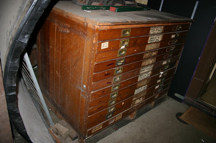 Wooden plan press with twelve drawers. Located in South Engine Room.