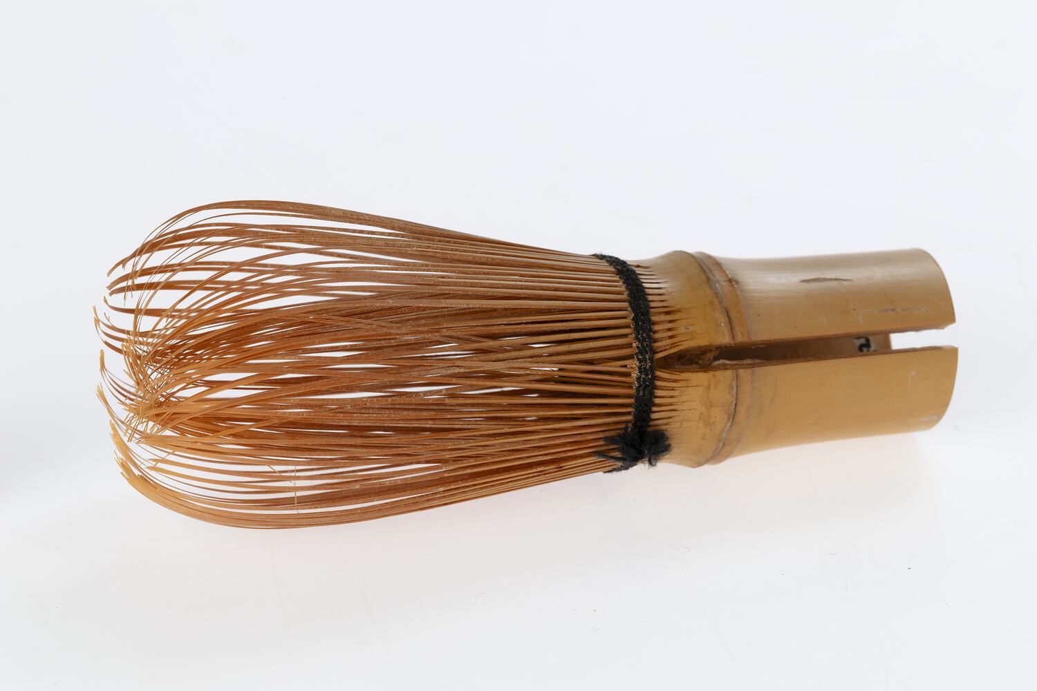 Japanese tea whisk made from a stick of bamboo. The handle end of the whisk is a hollow bamboo stick. The whisk is comprised of two layers of the bamboo which have been spliced finely, and held together at the base of the splice by cotton string.