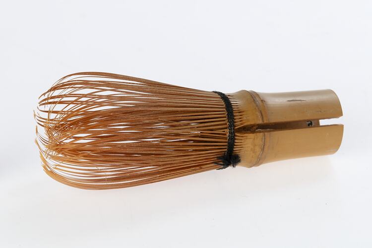 Bamboo Japanese tea whisk. It is part of a traditional Japanese 'hibati' tea-ceremony set, brought to Australia by Masumi Hiraga Jackson when she migrated to Australia in 1985.