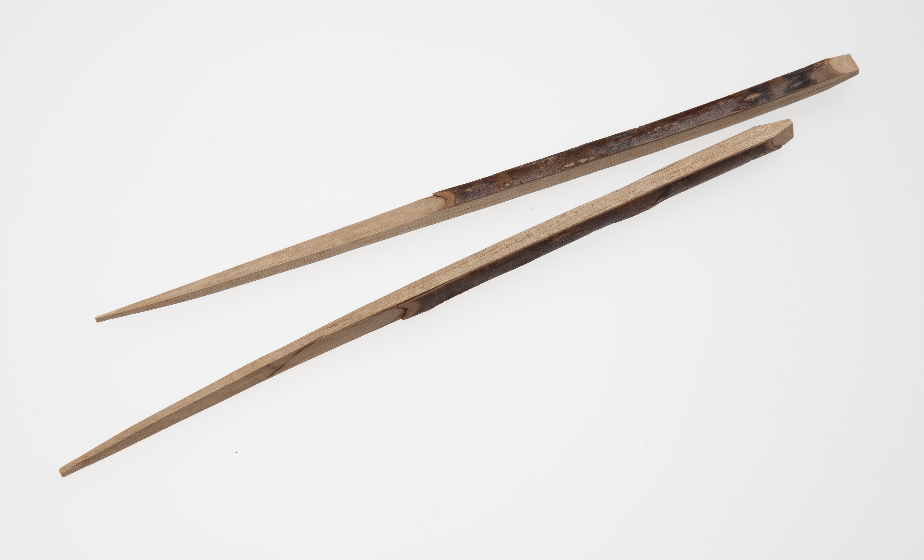 Pair of Japanese wooden picks for serving and eating sweets. It is part of a traditional Japanese 'hibati' tea-ceremony set, brought to Australia by Masumi Hiraga Jackson when she migrated to Australia in 1985. Masumi practices traditional Japanese tea ceremony in Melbourne, as part of her endeavours to maintain Japanese cultural activities in Melbourne. For Masumi, the traditional Japanese tea ceremony is an art form, one of beauty, tranquillity and simplicity of movement. Tea ceremony is the ritualised way of preparing, serving and drinking 'matcha' (powdered green tea). Tea drinking was introduced from China and first practised only by Buddhist priests, and then by samurai warriors. It gradually spread throughout Japan. Greatly influenced by Zen Buddhism, the tea ceremony has in turn influenced many aspects of Japanese culture.