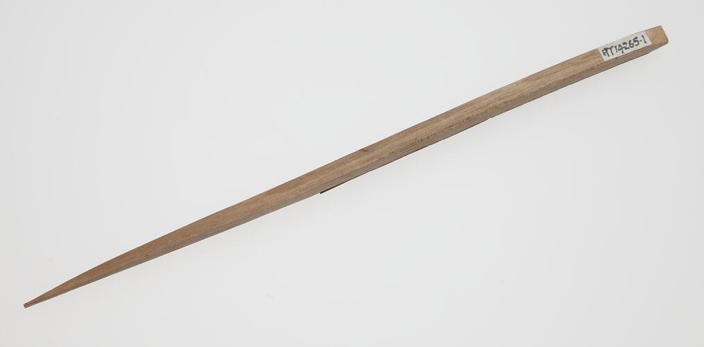 One of pair of Japanese wooden picks for serving and eating sweets.It is part of a traditional Japanese 'hibati' tea-ceremony set, brought to Australia by Masumi Hiraga Jackson when she migrated to Australia in 1985. Masumi practices traditional Japanese tea ceremony in Melbourne, as part of her endeavours to maintain Japanese cultural activities in Melbourne. For Masumi, the traditional Japanese tea ceremony is an art form, one of beauty, tranquillity and simplicity of movement. Tea ceremony is the ritualised way of preparing, serving and drinking 'matcha' (powdered green tea). Tea drinking was introduced from China and first practised only by Buddhist priests, and then by samurai warriors. It gradually spread throughout Japan. Greatly influenced by Zen Buddhism, the tea ceremony has in turn influenced many aspects of Japanese culture.