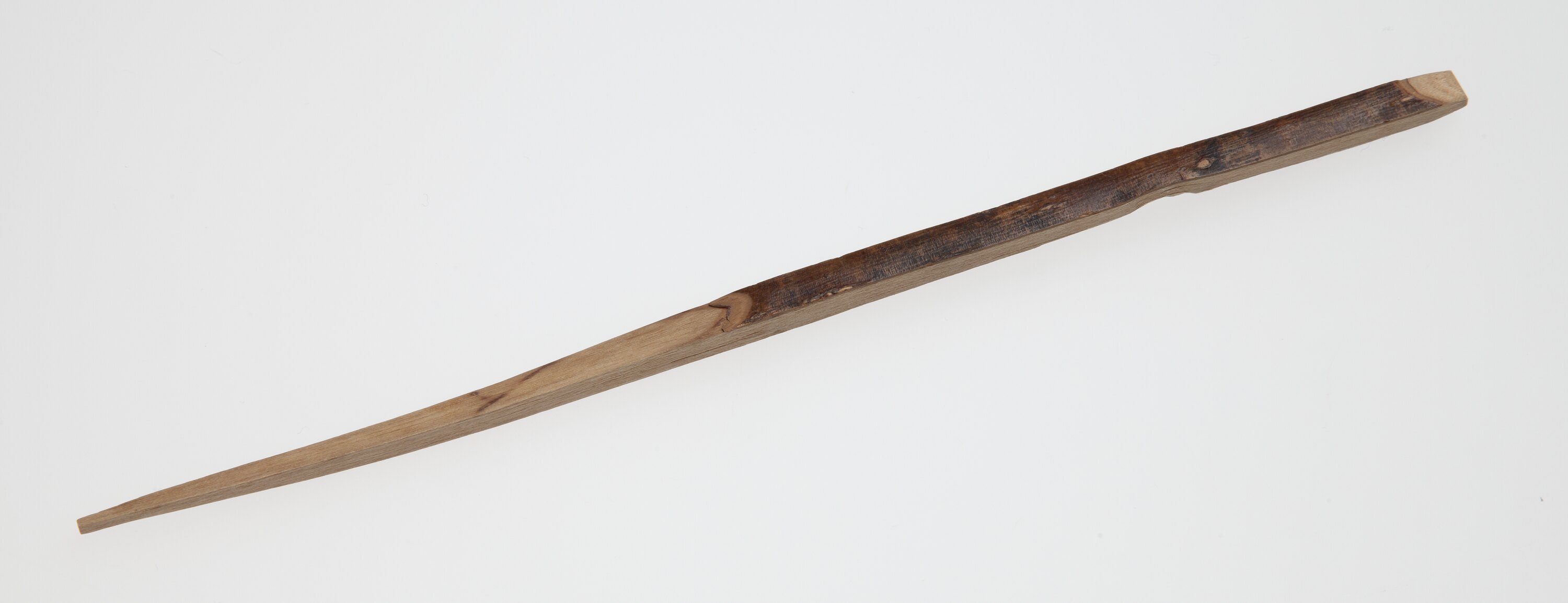 One of pair of Japanese wooden picks for serving and eating sweets. It is part of a traditional Japanese 'hibati' tea-ceremony set, brought to Australia by Masumi Hiraga Jackson when she migrated to Australia in 1985. Masumi practices traditional Japanese tea ceremony in Melbourne, as part of her endeavours to maintain Japanese cultural activities in Melbourne. For Masumi, the traditional Japanese tea ceremony is an art form, one of beauty, tranquillity and simplicity of movement. Tea ceremony is the ritualised way of preparing, serving and drinking 'matcha' (powdered green tea). Tea drinking was introduced from China and first practised only by Buddhist priests, and then by samurai warriors. It gradually spread throughout Japan. Greatly influenced by Zen Buddhism, the tea ceremony has in turn influenced many aspects of Japanese culture.