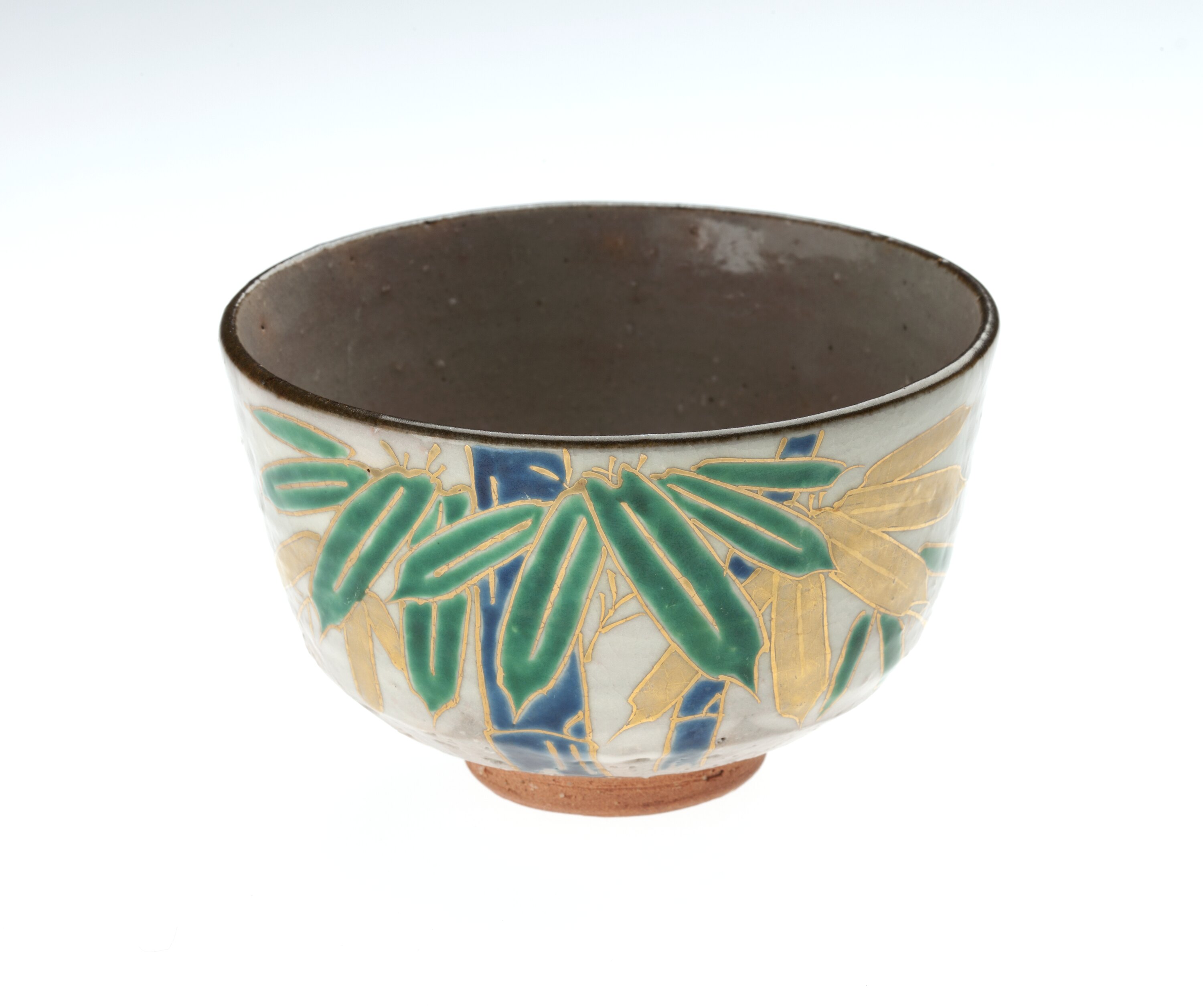 Circular, stoneware, hand-thrown ceramic tea bowl, glazed in a transparent coloured glaze, with bamboo leaf design, glazed and painted on one side in green, blue and gold.