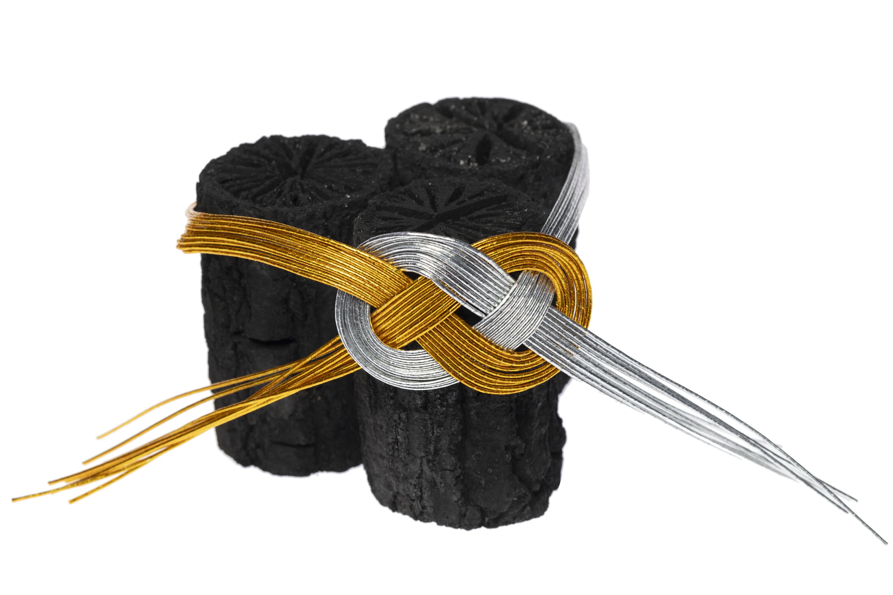 Set of three charcoal sticks, bound together with gold and silver coated wire.