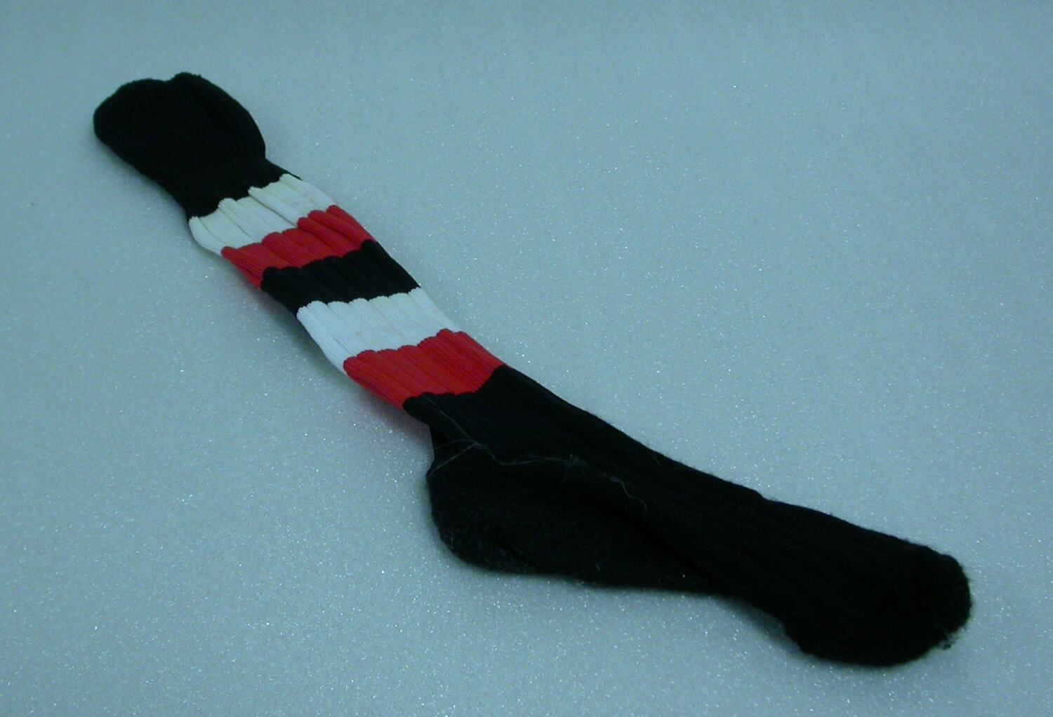 Pair of black socks with two pairs of red and white stripes. Part of Flying Machine Koala costume, from Koala Rescue section of 'The Boy on the Bay' a creative segment in the Opening Ceremony of the Melbourne 2006 Commonwealth Games.