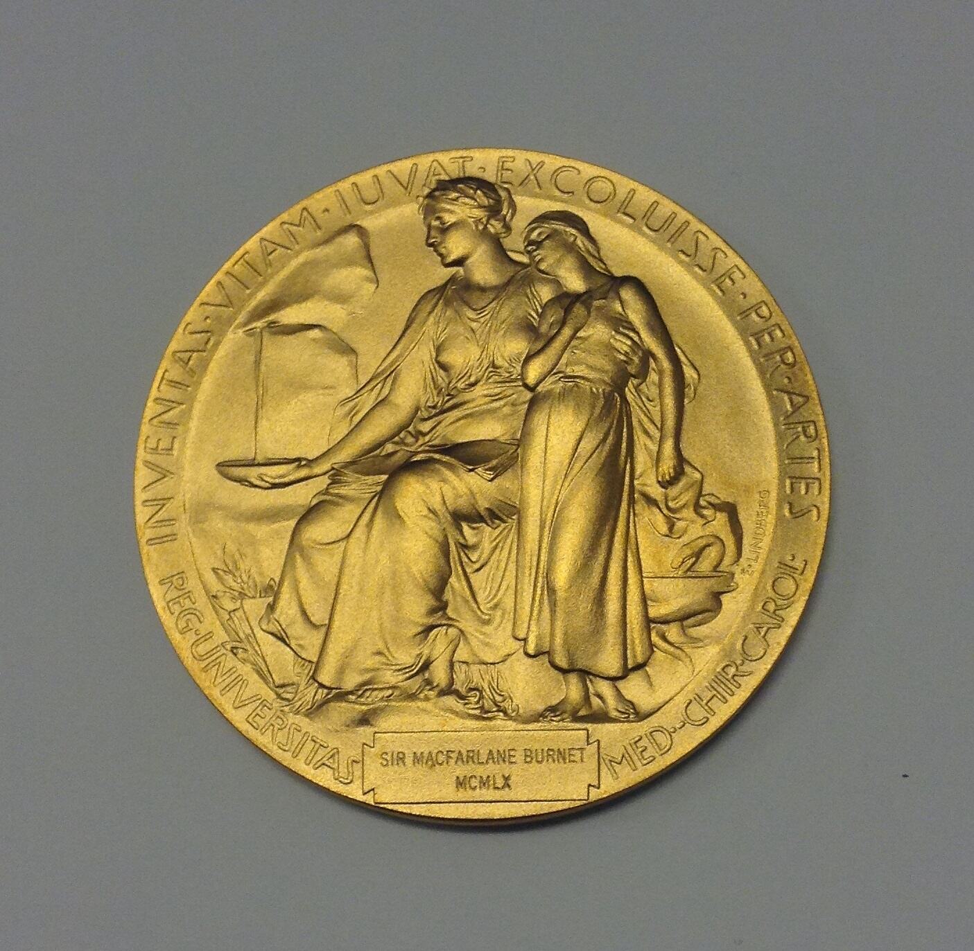The figures represent the Genius of Medicine holding an open book in her lap, collecting water pouring out of a rock in a bowl to quench a sick girl's thirst. Text around: 'INVENTAS VITAM IUVAT EXCOLUISSE PER ARTES'. This passage is taken from Virgil's Aenieid and means 'And they who bettered life on earth by new-found mastery'. 'REG UNIVERSITAS MED. -CHIR. CAROL'. This stands for the Karolinska Institute that awards the prize in medicine or physiology. In plaque at bottom: 'SIR MACFARLANE BURNET / MCMLX'. Artist's name: 'E. LINDBERG'.